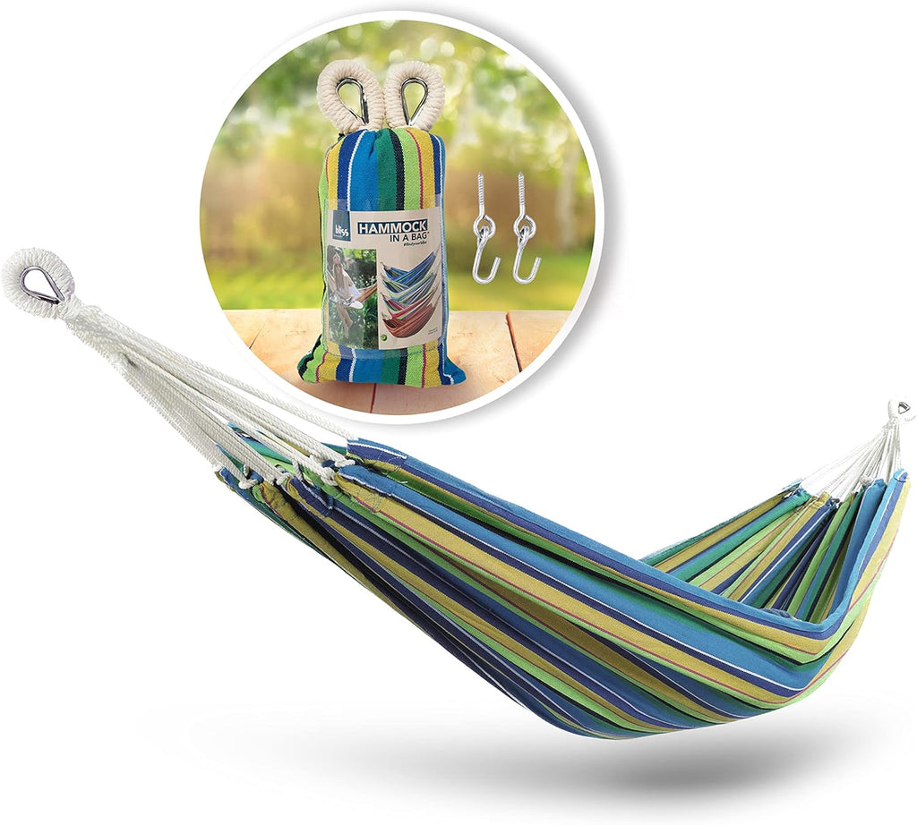 The Hammock in a Bag® is a versatile full size Brazilian style hammock. Made of a woven blend of breathable polyester and eco-friendly recycled cotton fabrics. It is the most comfortable gathered-end hammock, made to provide more comfort in commonly strained areas like the head, knees, and ankles. The loop ends are reinforced with steel and can be used both indoor and outdoor with great durability. All hanging hardware is included: (2) eye screws and (2) hooks making it easy to hang between trees or from an indoor ceiling and can be hung as a bed or a hammock chair. The overall weight capacity of this hammock is 250lbs. and comes with a one-year warranty...Find Your Bliss®